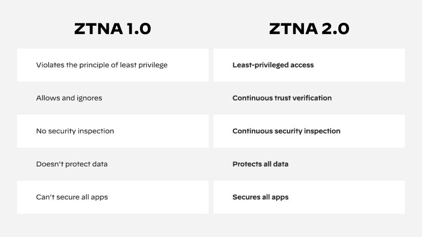 • Do not provide security inspection. ZTNA 1.0 solutions assume all allowed traffic is free from malware and other threats or vulnerabilities as they have no ability to detect or prevent malware or lateral movement across connections.