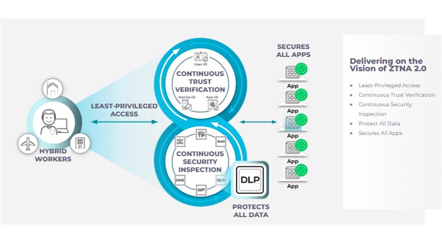 Zero Trust Network Access (ZTNA) 2.0 diagram showcases the benefits a ZTNA 2.0 solution offers with continuous trust verification and continuous trust assessment to secure all apps and data.