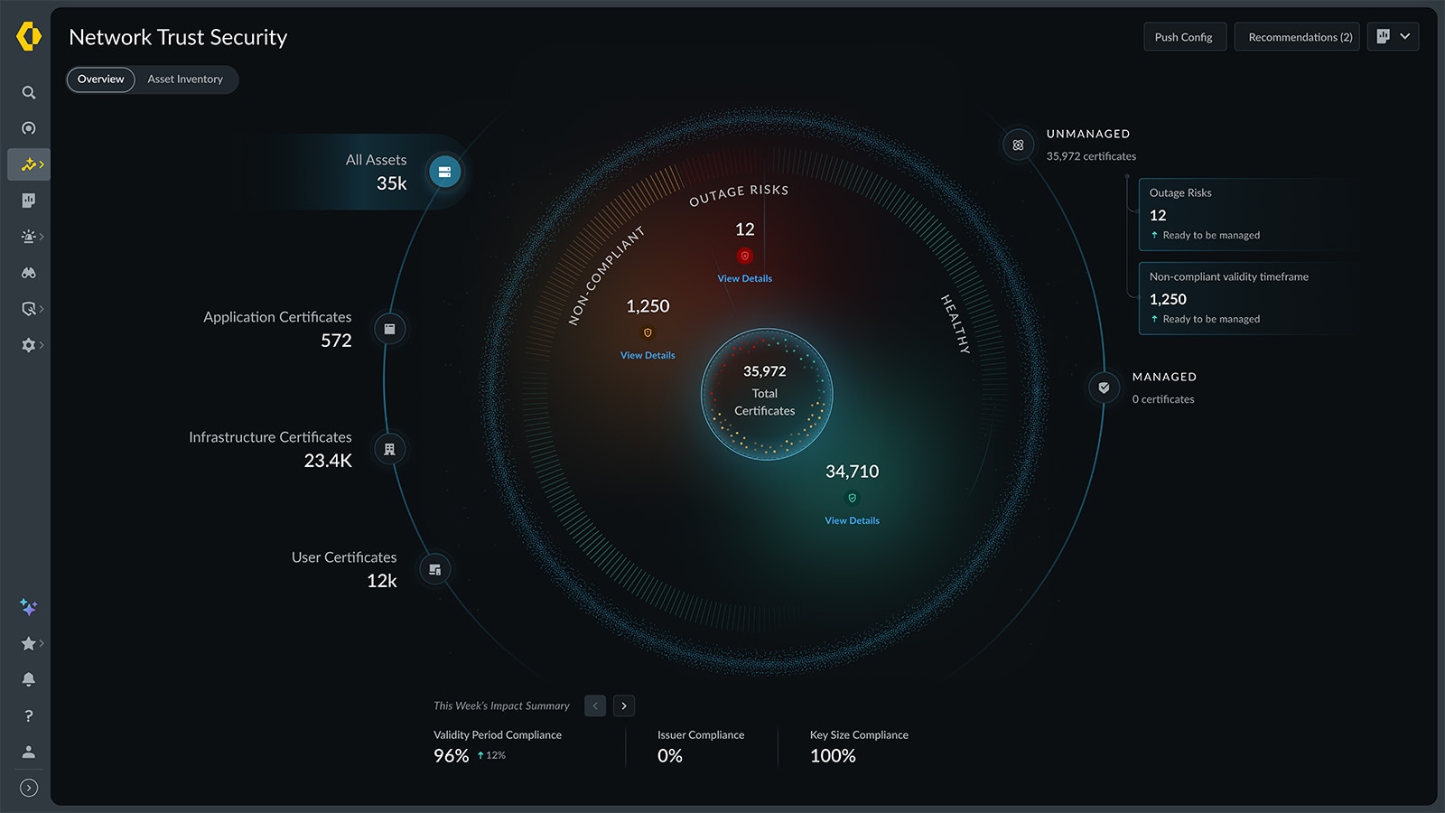 針對防火牆、遠端存取閘道器、工作負載、Kubernetes 叢集及內部系統,取得公用和私人憑證的統一可視性。透過單一權威目錄,識別所有權、到期狀態、核發單位以及政策一致性。