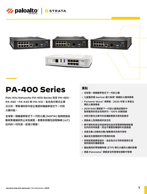 Palo Alto Networks PA-400 Series 包含 PA-460、PA-450、PA-440 和 PA-410,旨在為分散式企業分公司、零售場所和中型企業提供機器學習式下一代防火牆功能。
