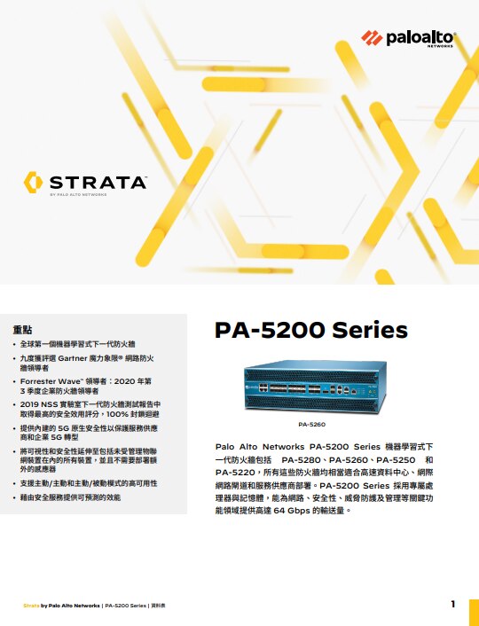 Palo Alto Networks PA-5200 Series 機器學習式新一代防火牆包括 PA-5280、PA-5260、PA-5250 和 PA-5220,所有這些防火牆均相當適合高速資料中心、網際網路閘道和服務供應商部署。